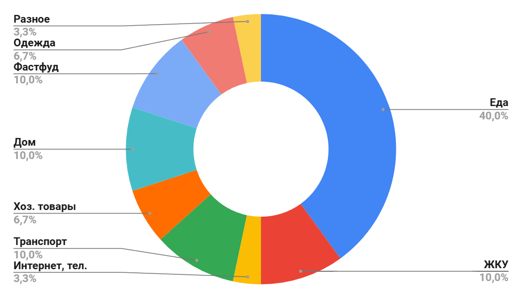 - Примерно 1 раз в неделю мы устраиваем “Читмил” идем в кафе или еда на вынос, это порядка 10% в месяц. Можно вообще было бы убрать, но тогда картина была бы менее сбалансированной. Я не стремлюсь к полной аскезе, поэтому небольшие радости, без последствий для здоровья и финансов, вполне допустимы.
