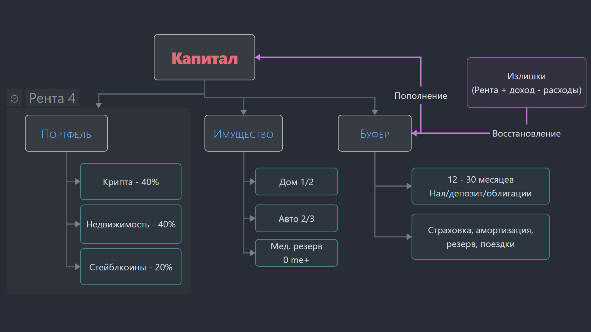 Такая схема позволяет даже тратить больше базовых потребностей, если я продолжаю хоть какую-то активность, приносящую доход. То есть можно тратить больше, чем покрывает портфель, при этом считать себя финансово независимым, но в то же время условно не работать, а заниматься интересными проектами без серьёзного давления обязательств. В принципе, можно было бы и этого не делать, просто жить на процент изъятия, но у большинства людей есть корневая потребность в самореализации. Я не исключение, поэтому планирую развиваться, будучи частично занятым.