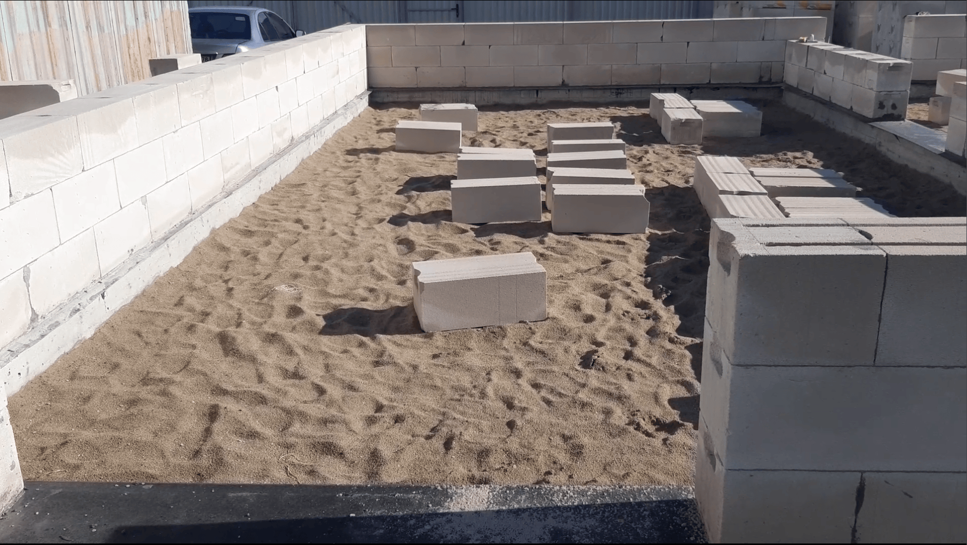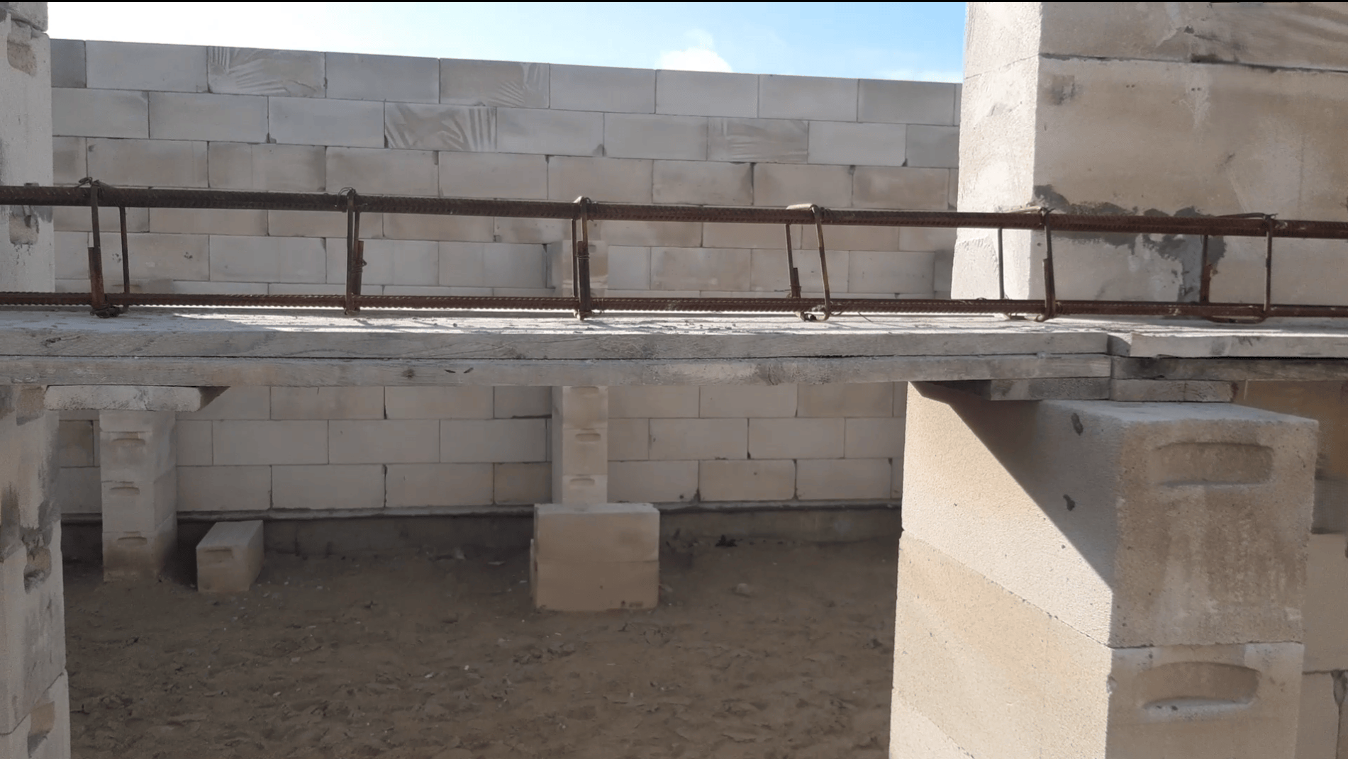 Усложняло задачу и то, что я не соорудил качественные леса и подмости для работ, а сделать их было просто не из чего. Поэтому мне пришлось строить столбики из блоков, которые предназначались для фронтонов, прямо на песке, фиксировать их к стене и на них уже укладывать переносные стеллажи длиной 2 метра, которые я смастерил из досок опалубки. Стеллажей у меня было всего четыре, на одну стену, а стенок - пять, поэтому приходилось таскать их с места на место. Хотя сами стеллажи были очень тяжелыми, я иногда начинал сомневаться, не выходит ли мой тренинг за рамки здорового подхода🤯