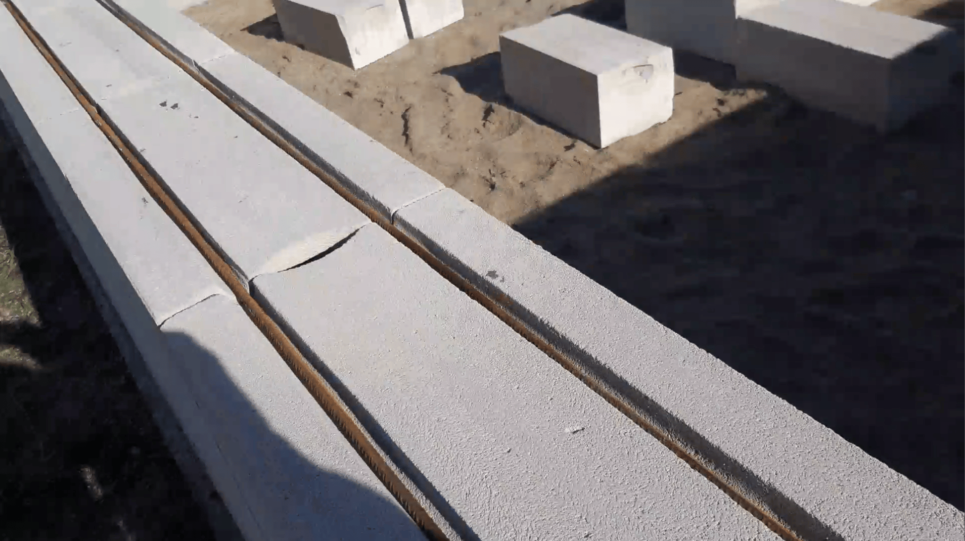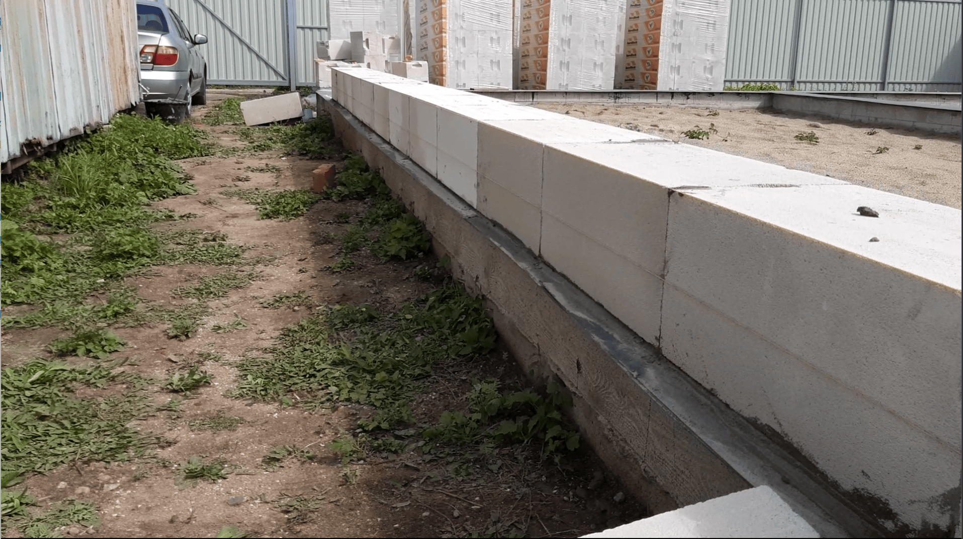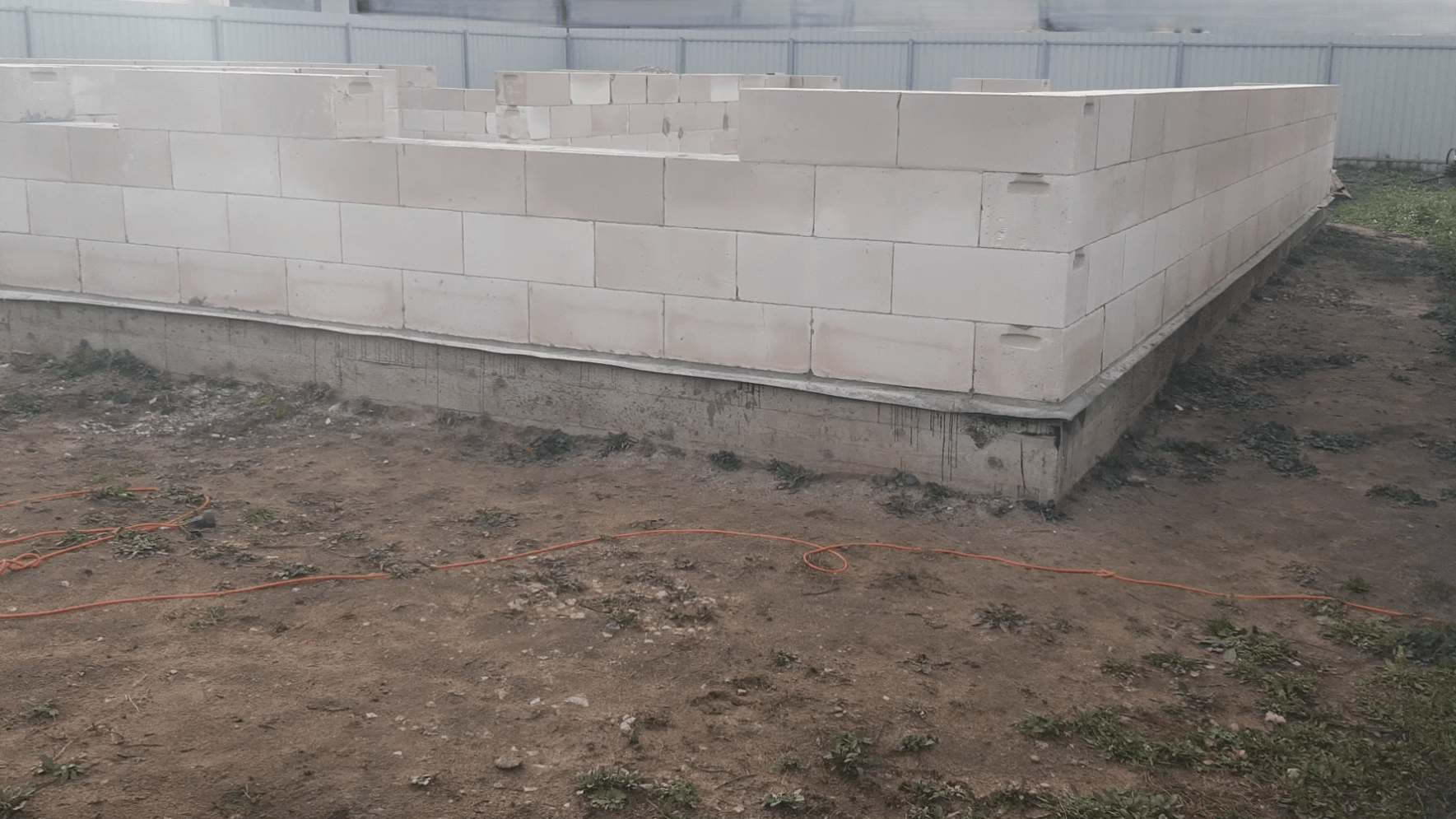 Затем я размечал угловые блоки, проверял диагонали, расстелил отсечную гидроизоляцию и выложил первый ряд блоков на раствор. Как положено, я заармировал его двумя прутами и приступил к основным работам. Это был важный этап, так как правильное выравнивание фундамента и установка первого ряда блоков являются основой для последующей кладки и всей конструкции в целом.