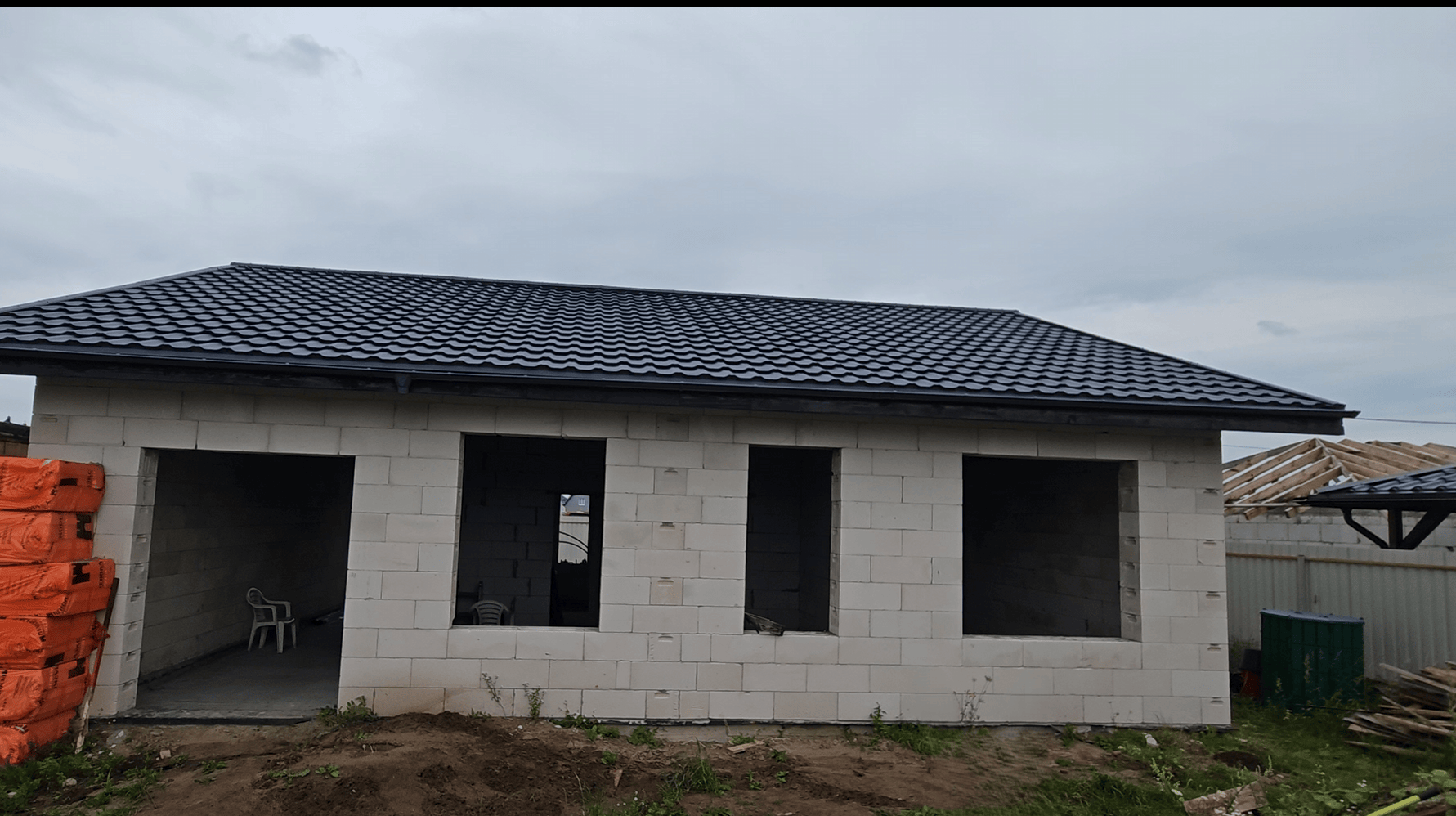 Газобетонные блоки имеют толщину 300 мм и плотность D500, утеплены каменной ватой толщиной 50 мм. Полы утеплены 10 см ЭППС, а перекрытия - 20 см каменной ваты. Двухскатная кровля выполнена из модульной металлочерепицы с фронтонами из газобетона. С северной стороны к дому будет смонтирован навес для автомобиля и терраса, что придаст законченный и эффектный вид. Площадь дома составляет 92,5 м², есть холодное чердачное помещение.