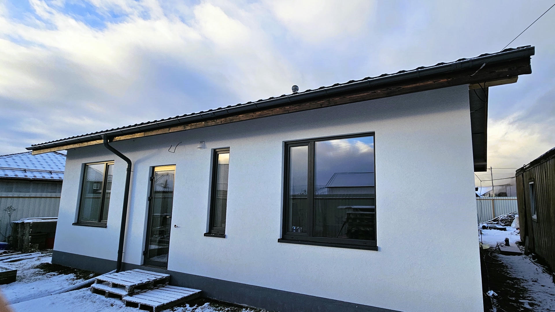Для кровли я выбрал качественную модульную металлочерепицу. Все материалы для кровли я подбирал, исходя из самых высоких стандартов качества: начиная от покрытия и заканчивая всеми пленками и утеплителем. Вероятно, именно поэтому затраты на кровлю были выше среднестатистических. То же самое касается окон и дверей: я выбрал довольно толстые энергосберегающие стеклопакеты. Сами окна, конечно, не в пол, как это сейчас популярно, но весьма большие и высокие, что позволяет обеспечить отличную освещенность в помещении и придает дому эффектный вид.