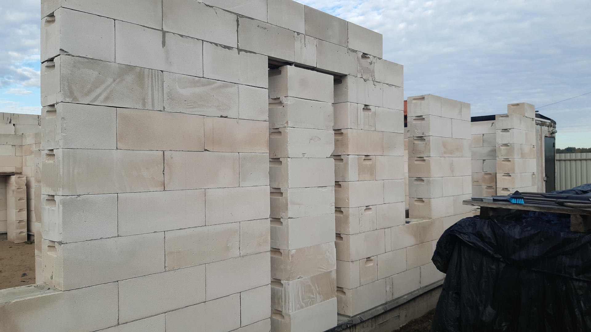 Я планировал заливать армопояс самостоятельно, но с наступлением зимы мне пришлось законсервировать стройку. Я накрыл полиэтиленом кладку и оставил ее до весны.