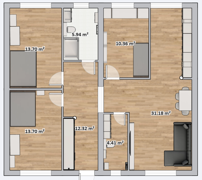 Слева расположен большой встроенный шкаф-купе. Затем находятся две жилые комнаты и ванная комната. В правой части, при входе, справа расположена котельная с вторым санузлом, где размещены все инженерные системы. Слева находится третья жилая комната, в которой у нас сейчас сооружен мини-спортзал.
