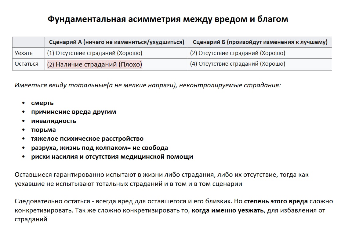 Для многих сложившаяся ситуация формирует иррациональное восприятие рисков. Связано это как всегда с когнитивными искажениями(например недооценка бездействия, отклонение в сторону статус-кво и др.). Многие не видят серьезную асимметрию в сценариях развития событий и как это будет влиять на индивида и его окружение. Некоторые пытаются спрогнозировать будущее, дум-скролят, слушают аналитику, надеются на изменения в стране и дескать знания об этом должны пролить свет на будущее. Но мы находимся в ситуации чудовищной неопределенности. Никакие из факторов не гарантируют развитие того или иного сценария. История знает сценарии тоталитарных режимов, когда в полной изоляции, беззакония и произвола жизнь человека окончательно обесценивается, никто не защищен, и не может рассчитывать на спокойное существование. Вот эти риски на интуитивном уровне мало кем могут ощущаться. Поэтому карточка может помочь разработать персональную стратегию.