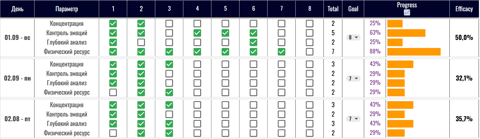 Следя за концентрацией и дисциплиной, мы охватываем множество параметров. Это может показаться сложным, но на самом деле требует минимальных усилий. Все, что нужно, — просто поставить галочку.