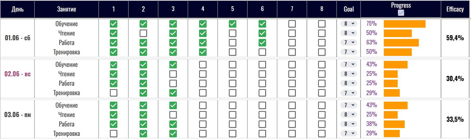 Цель не в том, чтобы добиваться 100% каждый день. Важно отслеживать, насколько мы способны быть сконцентрированными и дисциплинированными.